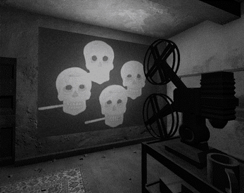 You wake up in a small and messy room. There's a storm raging outside, with the lightning illuminating a projector in the middle of the room. You investigate the projector, which surprisingly is still equipped with a film reel. You get it going, but you're not sure if that was the best decision...